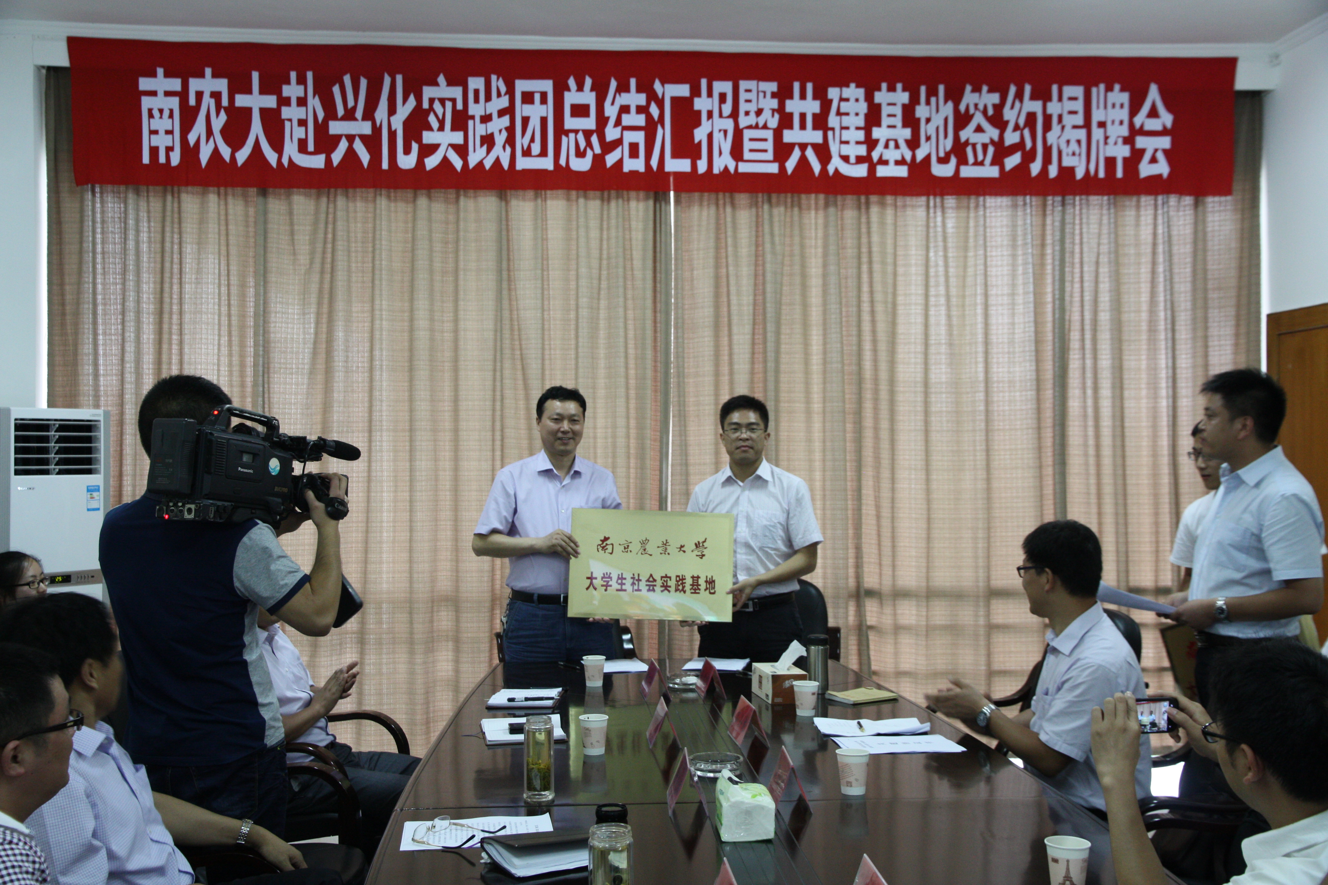 2014年7月14日下午,“南农大赴兴化实践团总结汇报暨共建基地签约揭牌会”在兴化市政府林牧业局举行,出席会议的有兴化市林牧业局陈友洪局长、共青团兴化市委员会吉金楼书记、兴化市大邹镇党委刘启元书记、兴化市委组织部人才科袁文华科长,共青团南京农业大学委员会夏镇波书记、南京农业大学麻豆成人