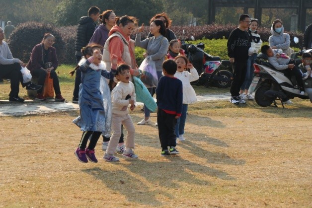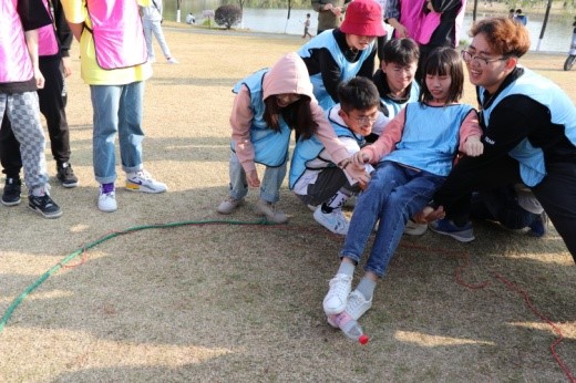第二个项目是同心鼓。游戏开始时,每组所有人都上场,每个人拉着鼓的一根绳子,每个队员牵拉一根绳子,保证鼓面水平。同时另选出一名队友将一个排球从鼓面中心上方竖直抛下,队员们齐心协力将球颠起,颠球次数最多者胜出颠的次数最少的组享受抽签惩罚。该项目非常考验团队协作能力,需要每个人的通力配合,最后大家的成绩都很不错,最高的组颠了118次。同心鼓项目还引来附近小朋友的热烈加油,现场气氛燃到极点。