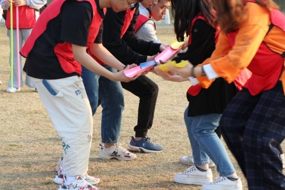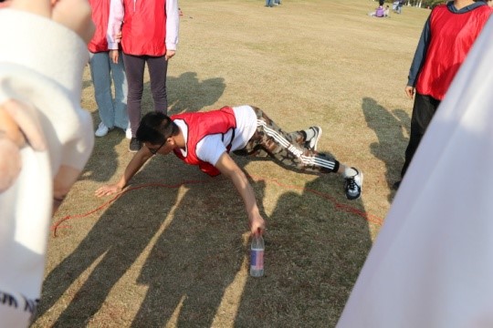 管老师先是用一个小游戏带动了大家的氛围,然后将所有人分为了红、粉、蓝三组,还分发了相应颜色的小马甲,每个小组还展示了各自的队旗、口号和队歌。随即开始进行正式活动。活动分为三个项目:一、雷区取瓶;二、同心鼓;三、决胜150。
