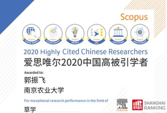 郭振飞教授入选草学高被引学者榜单,成为全国草学领域仅有的3名上榜学者之一。