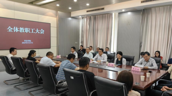 新任党委书记任职决定。校党委常委吴群、党委组织部副部长陈洁、学院新任党委书记戴廷波、原党委书记李俊龙、原院长张炜,其他院领导及全体教职工参加大会。会议由陈洁主持。