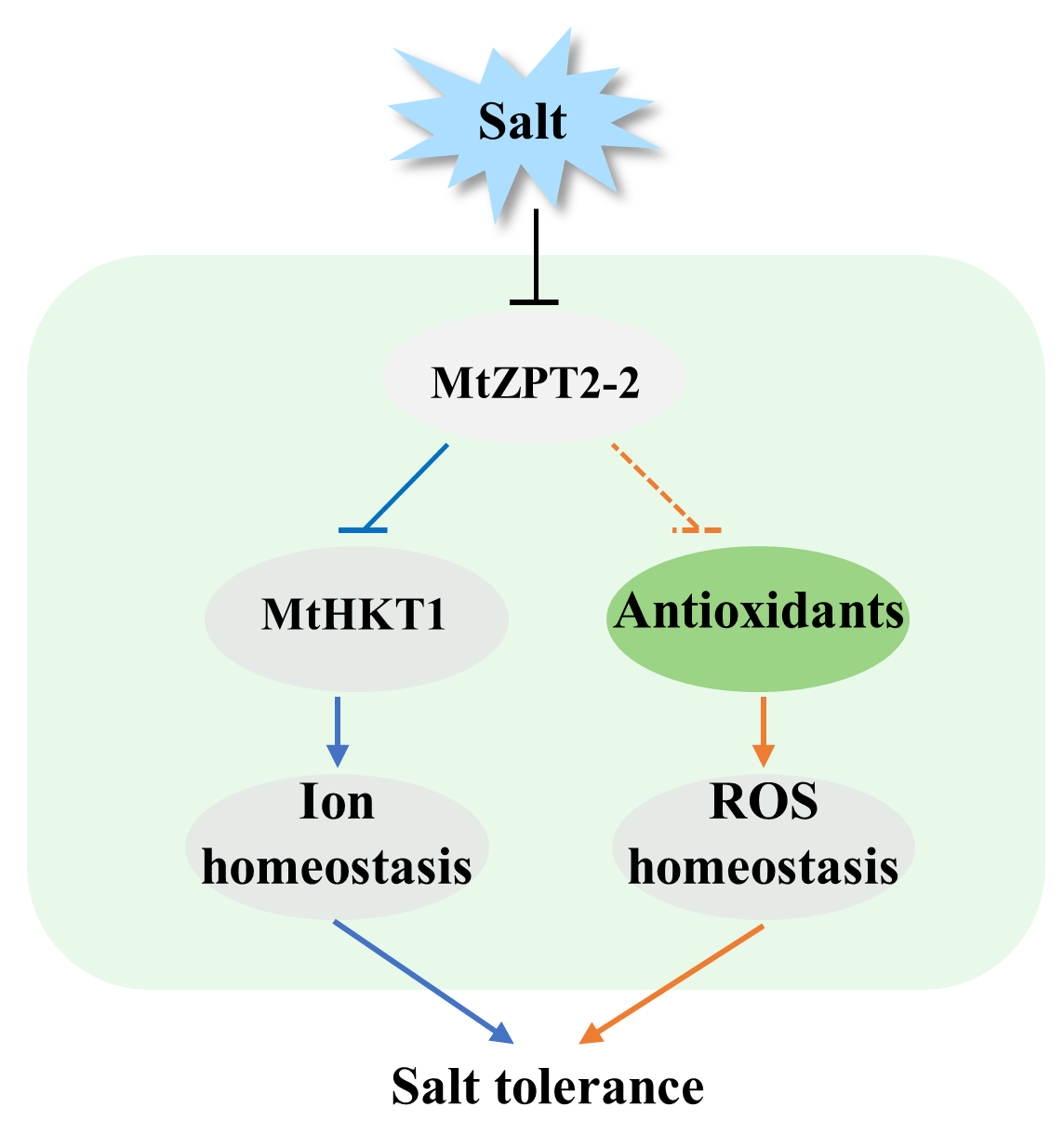 该研究发现蒺藜苜蓿MtZPT2-2主要在根系和地上部的输导组织表达,而且MtZPT2-2的表达受盐胁迫抑制,过表达MtZPT2-2的转基因蒺藜苜蓿耐盐性降低,而基因编辑突变体耐盐性提高,表明MtZPT2-2负调控蒺藜苜蓿耐盐性。进一步发现MtZPT2-2是一个细胞核定位的转录抑制因子。盐胁迫导致 MtHKT1;1和MtHKT1;2的转录水平和木质部中钠离子含量提高,MtZPT2-2突变体中MtHKT1;1和MtHKT1;2的转录水平高于野生型,木质部中钠离子含量低于野生型,而过表达株系呈现相反的趋势。深入研究发现MtZPT2-2可以直接结合MtHKT1;1 和MtHKT1;2的启动子并抑制其表达。此外,盐胁迫诱导了抗氧化酶基因表达上调和抗氧化酶活性提高,MtZPT2-2突变体中这些基因的转录水平和抗氧化酶活性高于野生型,而过表达株系低于野生型。综上所述,该研究揭示了蒺藜苜蓿通过下调地上部MtZPT2-2基因的表达应对盐胁迫的分子机制:盐胁迫抑制MtZPT2-2的表达,直接导致MtHKT1;1和MtHKT1;2表达上调,促进盐胁迫下Na+稳态的维持;间接上调抗氧化酶基因的表达,维持ROS稳态。通过下调MtZPT2-2基因表达能有效提高苜蓿耐盐性,因此该基因在苜蓿分子育种中可能具有广阔应用前景。