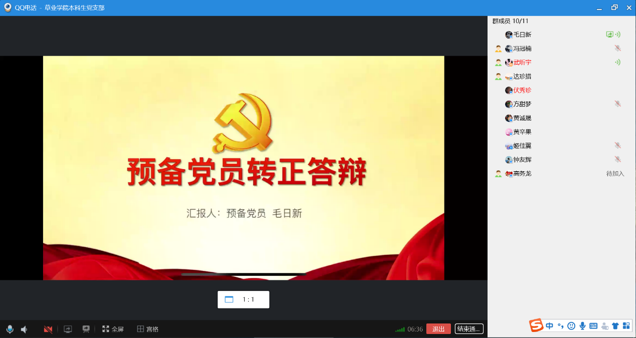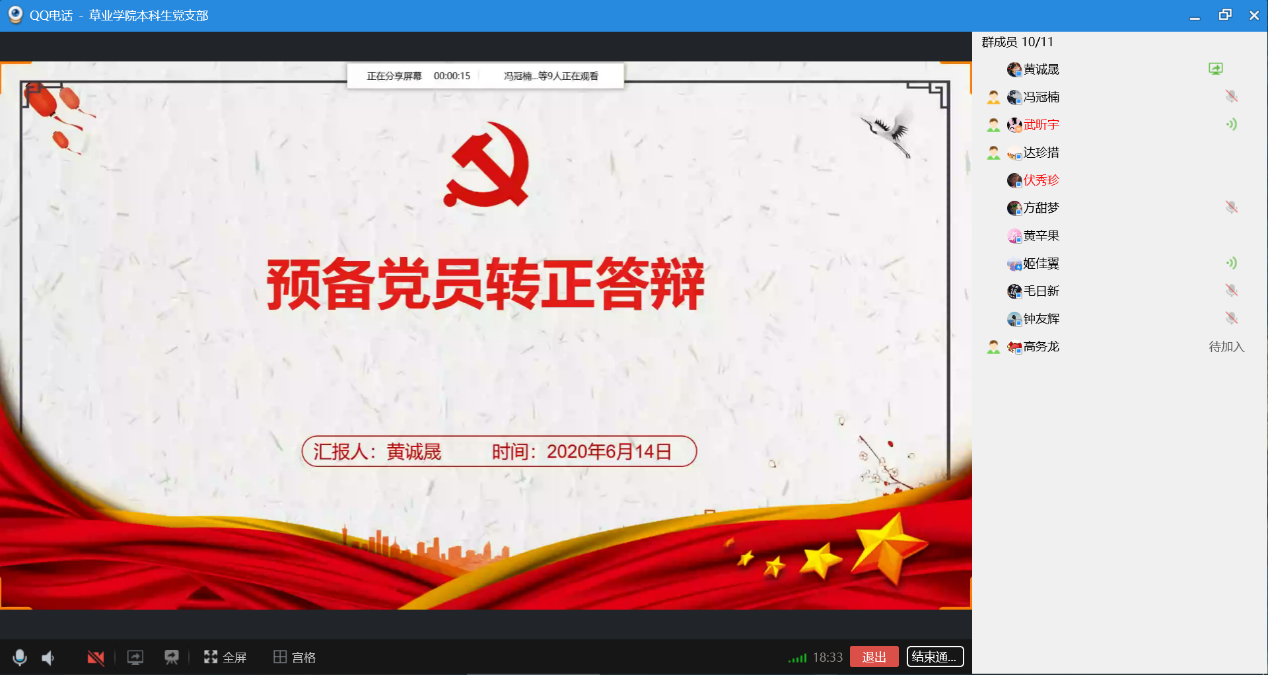 本科生党支部利用QQ视频召开了支部预备党员转正大会。会议商讨了支部预备党员黄辛果、毛日新、姬佳翼、黄诚晟四位同志的转正事宜。会议由本科生支部书记武昕宇主持,本科生党支部全体成员参与了本次会议。