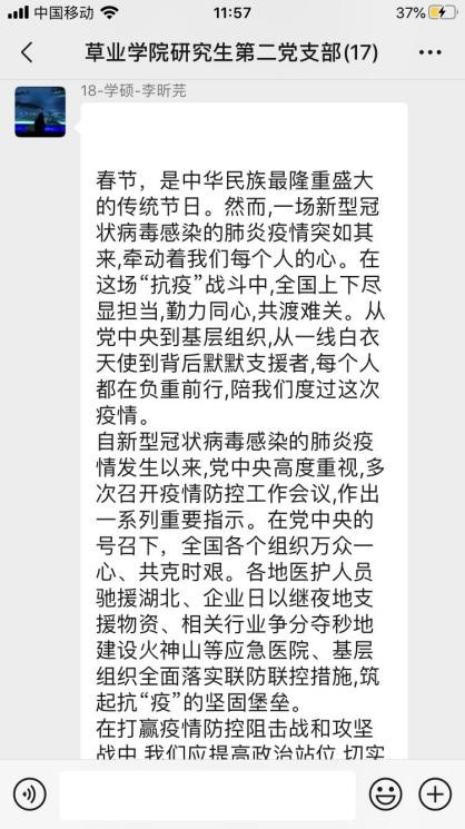 研究生第二党支部开展线上理论学习。研究生第二党支部全体党员参与了本次线上学习,本次理论学习讨论会议由党支部副书记季晓敏同志主持。