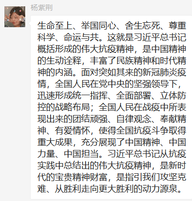 会议第一项,党支部书记赵娜结合党史分析我党在以往面对天灾人祸时的应对方案及措施,反映了中国共产党的政治优势和制度优势;随后,又结合历史事件,对我党在本次抗击新冠肺炎疫情中的正确领导部署和在疫情中无私奉献的英雄予以肯定与赞扬。