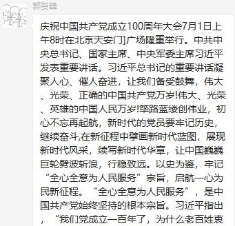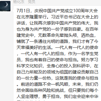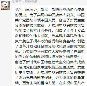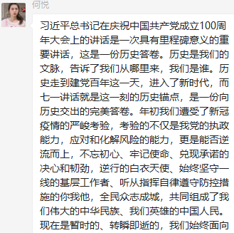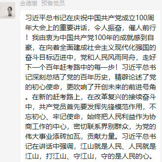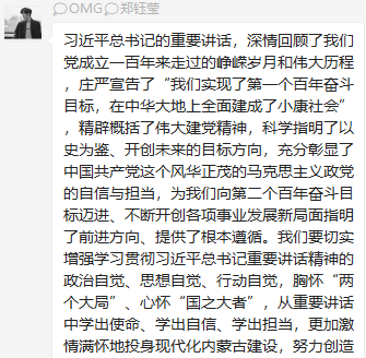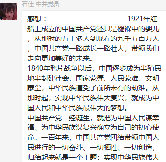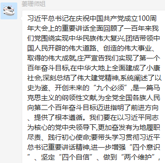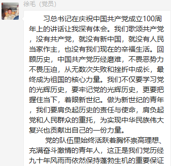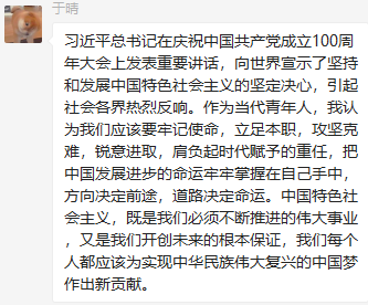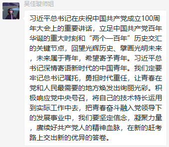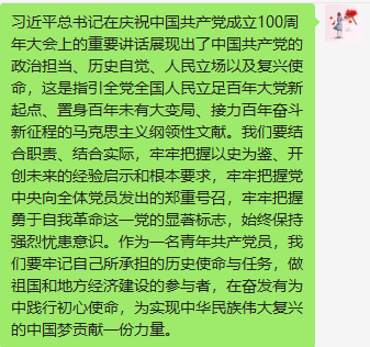 董瀛潞同志在麻豆成人 研究生第三党支部党员群中分享了与习近平总书记在庆祝中国共产党成立100周年大会上的重要讲话相关的资料和视频,党支部各党员在群里积极发表学习心得。中国共产党的先驱们不怕牺牲、英勇斗争,开创了中国历史新纪元。我们要继续弘扬光荣传统、赓续红色血脉,永远把伟大建党精神继承下去并发扬光大。作为新时代的青年党员,我们要以实现中华民族伟大复兴为己任,牢记“请党放心、强国有我”的铮铮誓言,长志气、有骨气、添底气,成为堪当民族复兴重任的社会主义建设者和接班人。