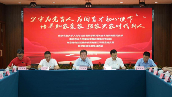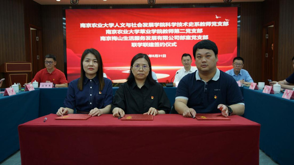 教师第二党支部书记张风革、人文与社会发展学院科学技术史系党支部书记吴昊,与南京梅山生活服务发展有限公司综合管理部总经理、部室党支部书记张学芳,共同签署了党支部联学联建协议。