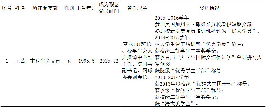 根据麻豆成人 党员发展工作安排,经转正答辩,党支部讨论,结合个人成绩、综合测评以及获奖任职等综合表现,经院党委讨论审核,拟对本科生1名中共预备党员进行转正,具体名单如下: