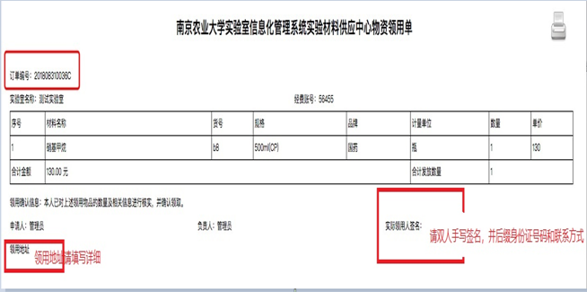 4.实验室与设备管理处将购买的管制类危险化学品上架,并按照订单顺序发货,申购人从平台查询发货通知后,自行打印领用单,携带身份证件和校园卡,凭单到化学试剂仓库领取。(见下图1