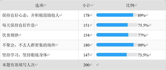 90%能做到不聚会,不去人群密集的场所;77%能做到饮食规律;75.5%能保持良好作息;89%能保持良好心态,并积极鼓励他人;73.5%能坚持学习,坚持锻炼身体。
