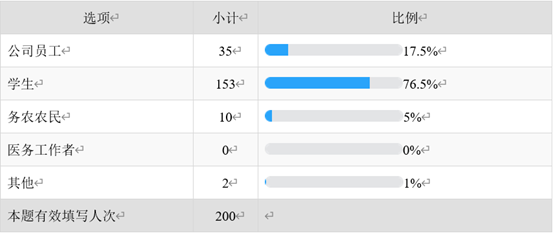 首先是参与本次调查的人群类型情况,参与者大多数是学生,占比达到76.5%,其次是公司员工,占比达到17.5%。