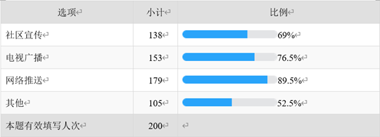 89.5%是通过网络推送获取疫情相关信息,69%是通过社区宣传获取疫情相关信息,76.5%通过电视广播了解疫情,52.5%通过其他方式了解疫情。