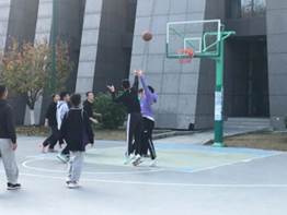 本科生对研究生的比赛。当研究生学长们脱下实验服,换上球服,他们就成了球场上的运动健将。一次次迅速的快攻和精准的上篮让人不禁拍手叫好。而本科生们也不遑多让,很快组织起严密的防守,寻找机会,组织进攻。最终研究生以一分的优势赢得比赛。