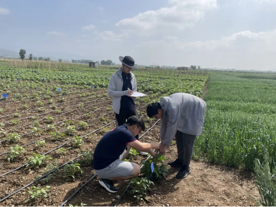小组成员在田间测量植株数据
