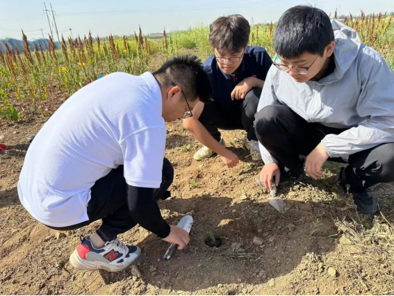 小组成员在田间栽种幼苗