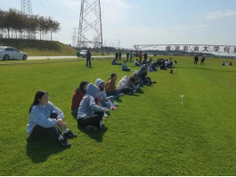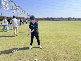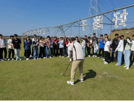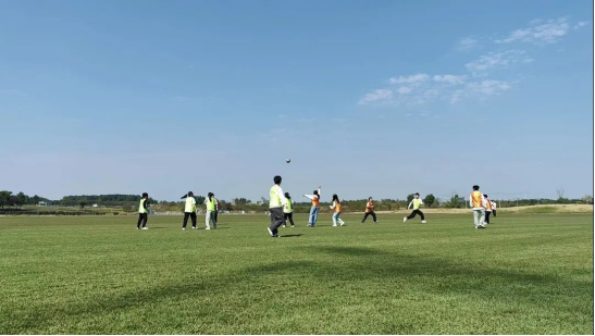 在竞争激烈的足球对抗赛后,杨志民老师带领下大家到了另一片草坪,为大家讲解了高尔夫球的基本知识,示范了高尔夫球挥杆的动作要领、安全要求和基本打法。同学们纷纷上场练习,在小球被打中或打空、打远或打近、地滚或高飞的过程中,笑声与汗水把疲惫一扫而空。