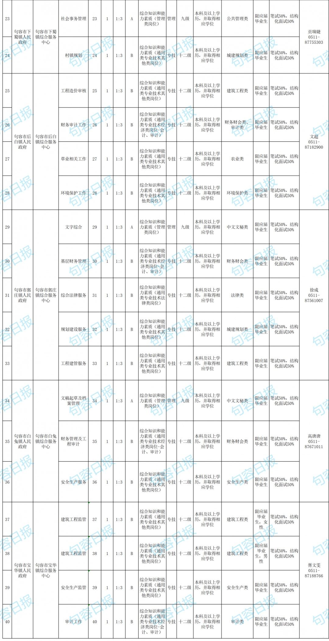 根据《事业单位公开招聘人员暂行规定》(人事部第6号令)、《江苏省事业单位公开招聘人员办法》(苏办发〔2020〕9号)精神,结合事业单位岗位空缺情况和工作需要,句容市部分事业单位面向社会公开招聘40名工作人员。