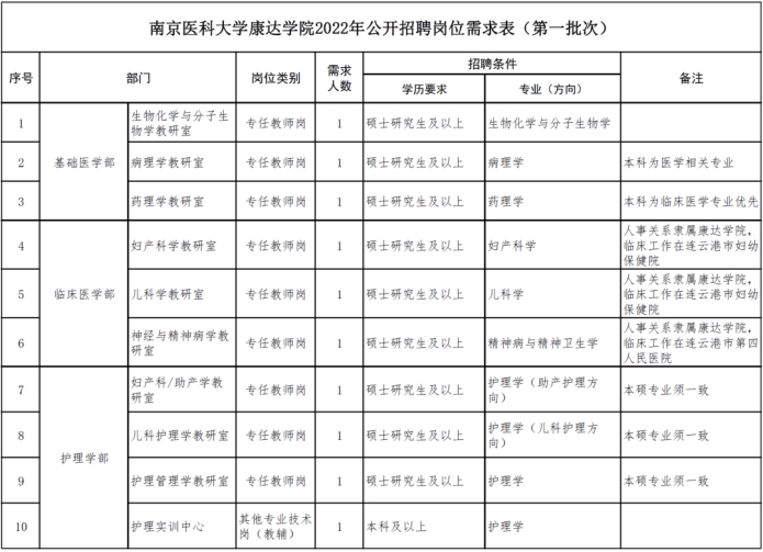 4.具备《南京医科大学康达学院2022年公开招聘岗位需求表(第一批次)》中岗位要求的资格条件。
