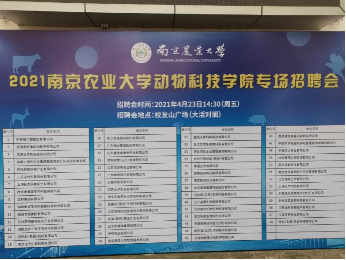 南京农业大学动物科技学院于2021年04月23日下午组织专场招聘会,期中共包括20家上市企业的58家农牧企业、生物制药企业等单位来校招聘,除农牧技术岗位外,还提供大量财务、管理、技术、机械工程、软件工程等岗位。欢迎全校各专业毕业生积极参加!!!