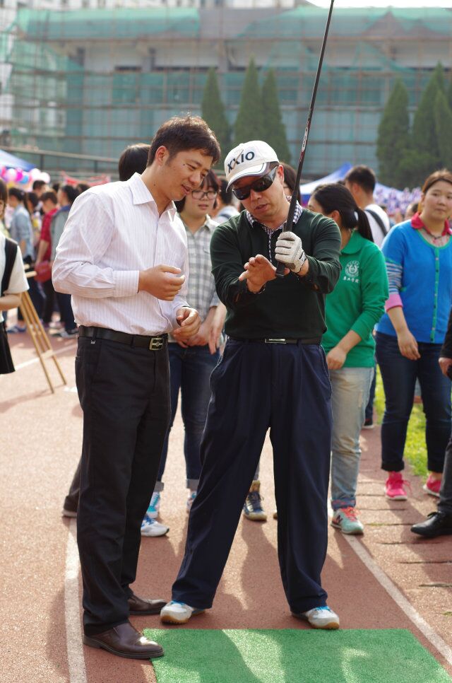 高度重视本次活动,学院杨志民副教授不仅提供出自己的球杆以供同学们学历了解高尔夫相关知识,还亲临现场示范正确的挥杆姿势,指导同学体验高尔夫。