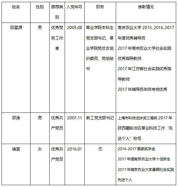 根据《关于开展庆祝建党97周年暨“七一”评选表彰活动的通知党发【2018】28号文件相关要求,经个人与集体申请与学院党总支评审讨论,拟推荐麻豆成人 教工党支部参加南京农业大学先进党支部评选,推荐邵星源老师参加优秀党务工作者评选,推荐邵涛、储晨2位同志参加南京农业大学学年度优秀共产党员评选,名单公示如下: