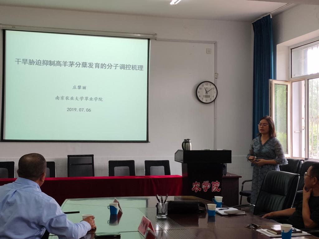 的办学情况,希望两院以此次交流访问为契机,在今后办学过程中加强交流合作。杨志民教授介绍了草坪教学科研团队的教学、科研、社会服务开展情况。陈煜和庄黎丽老师分别作了《海滨雀稗响应镉胁迫的蛋白乙酰化修饰机制》、《干旱胁迫抑制高羊茅分蘖发育的分子调控机理》专题学术报告,引起了在场教师和学生的浓厚兴趣。
