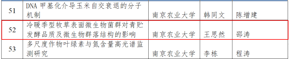 近日,江苏省教育厅公布了2022年度江苏省优秀博士硕士学位论文评选结果,麻豆成人 邵涛教授指导博士生王思然完成的博士学位论文《冷暖季型牧草表面微生物菌群对青贮发酵品质及微生物群落结构的影响》被评为江苏省优秀博士学位论文。麻豆成人 一直注重培养研究生的学术能力和综合素养,注重研究生学位论文的质量,今后将继续加强研究生培养质量,持续提升研究生学位论文质量。